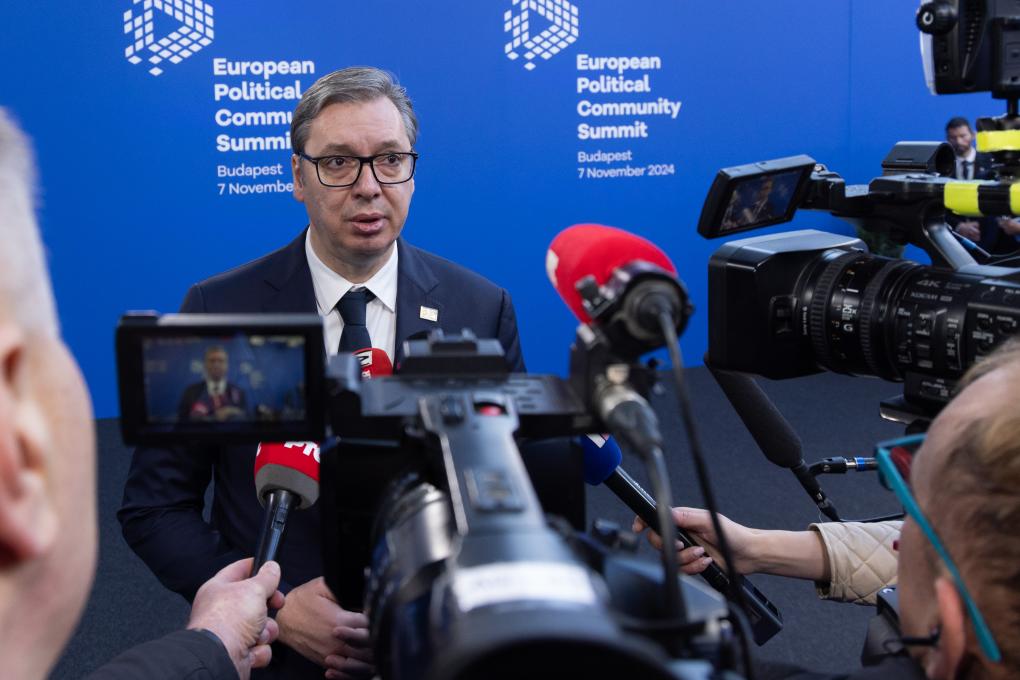 2024年11月7日,在匈牙利布达佩斯,出席第五届欧洲政治共同体领导人会议的塞尔维亚总统武契奇接受媒体采访。新华社发(弗尔季·奥蒂洛摄)