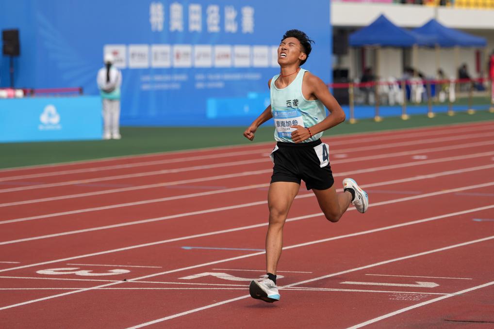 当发令枪响,索南加参的身形舒展开来。这一次,他没有戴墨镜,纯粹凭着肌肉记忆向着前方迈开步伐,每一步都带着冲破重峦叠嶂的力量。在特奥田径男子16-21岁组800米第七组的比赛中,索南加参第一个冲过终点线。