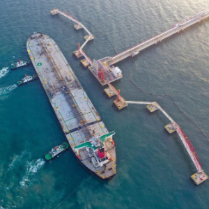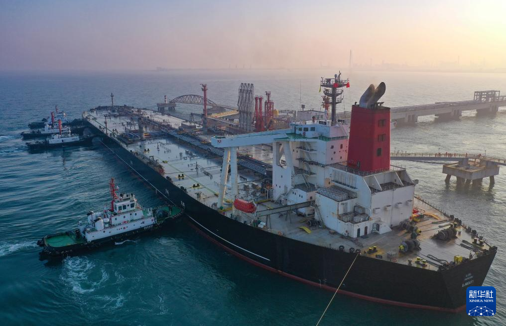 12月18日,一艘装载着17.9万吨石化原辅料的船舶泊入国投洋浦油储码头30万吨级原油泊位(无人机照片)。