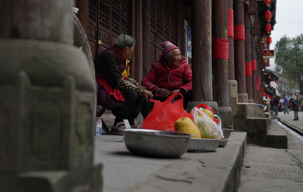村民在昭化古城内聊天。