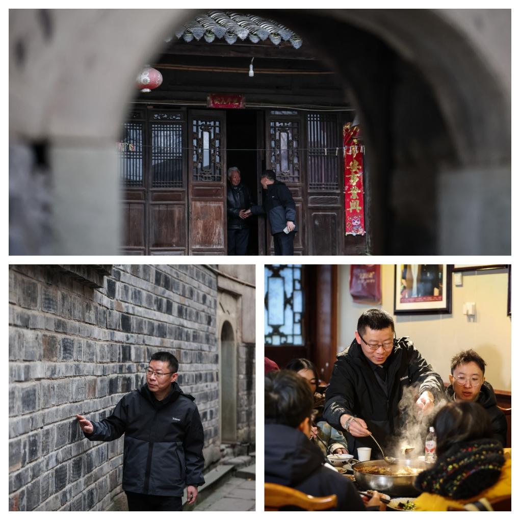 拼版照片:上图为翟志刚(右)在一户村民家中交流后道别(2025年12月13日摄);左下图为翟志刚走在昭化古城巷子里;右下图为翟志刚在自己经营的餐馆内为客人提供服务(2025年12月13日摄)。
