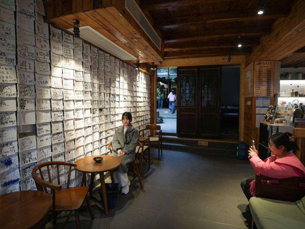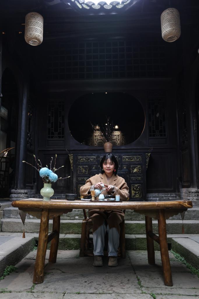 “95后”茶室主理人杨沫在昭化古城一家茶室内制作茶品(2025年12月13日摄)。