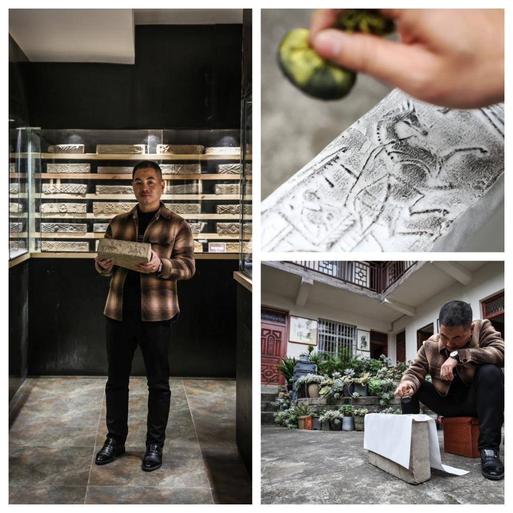 拼版照片:左图为昭化区昭化镇汉代画像砖收藏者饶斌在自己的收藏馆里(2025年12月13日摄);右上图为饶斌在家中制作汉砖拓片;右下图为饶斌在家中展示汉砖拓片(2025年12月13日摄)。