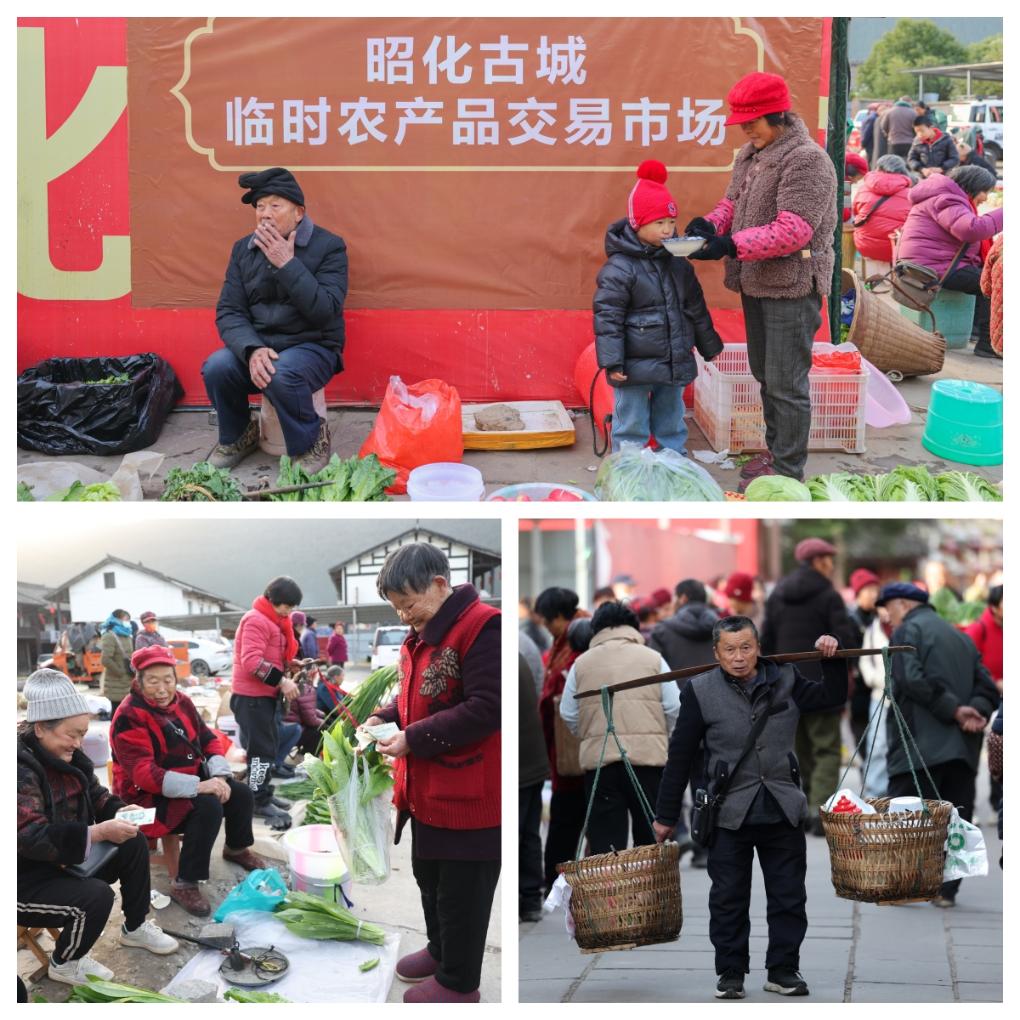 拼版照片:当地农户在昭化古城的早市上卖菜。