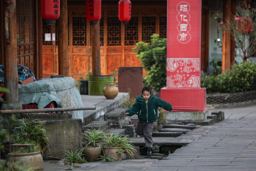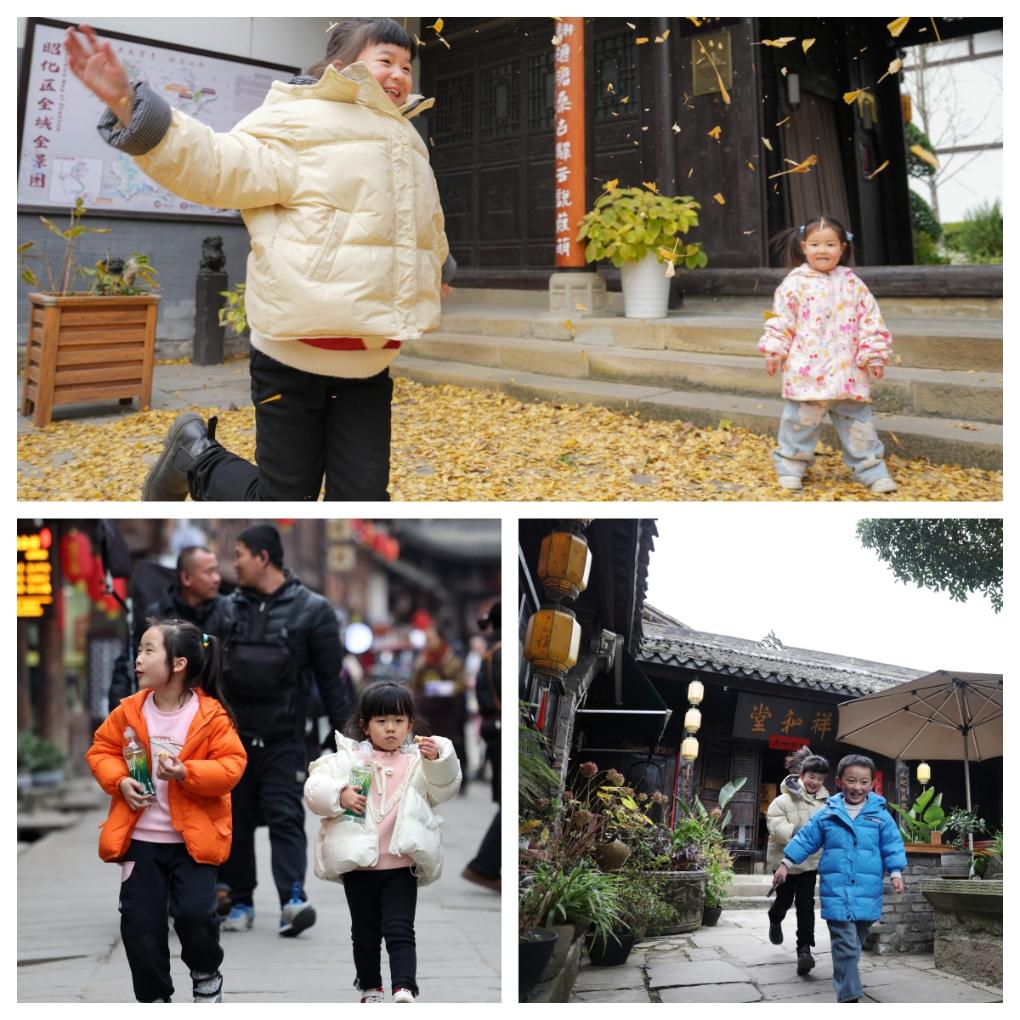拼版照片:小朋友在昭化古城内玩耍。