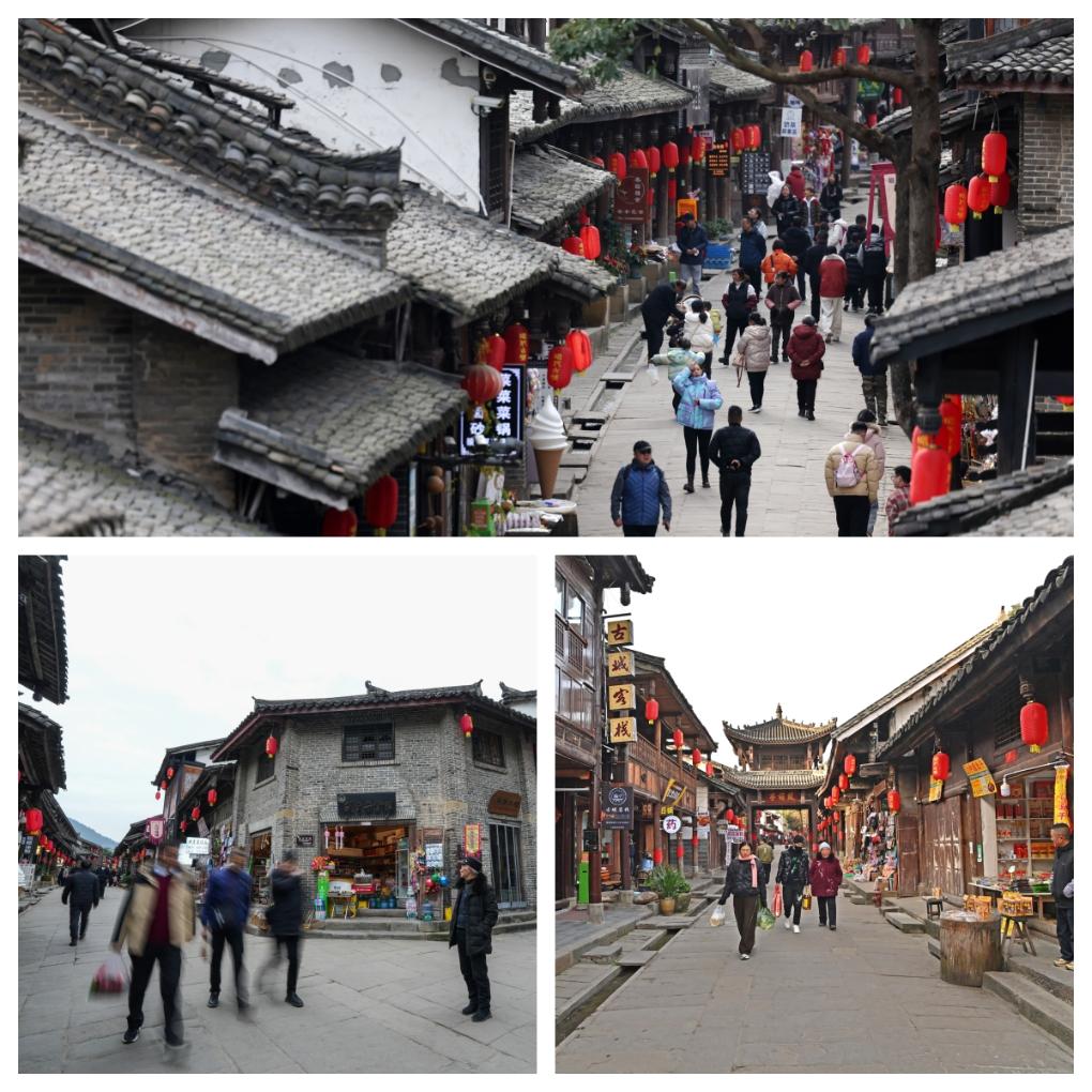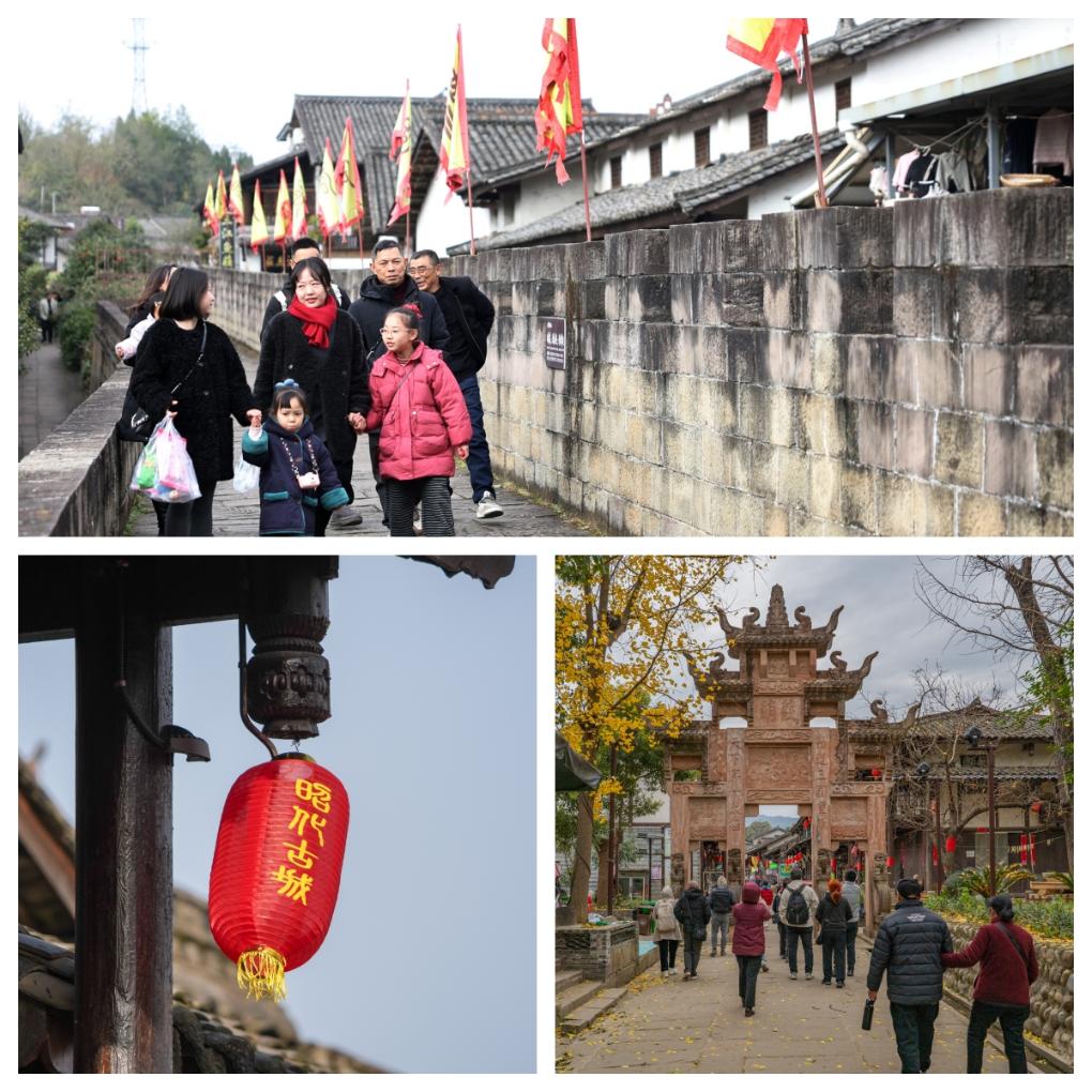 拼版照片:上图为游客在昭化古城观光游览(2025年12月12日摄);右下图为游客在昭化古城观光游览(2025年12月12日摄)。