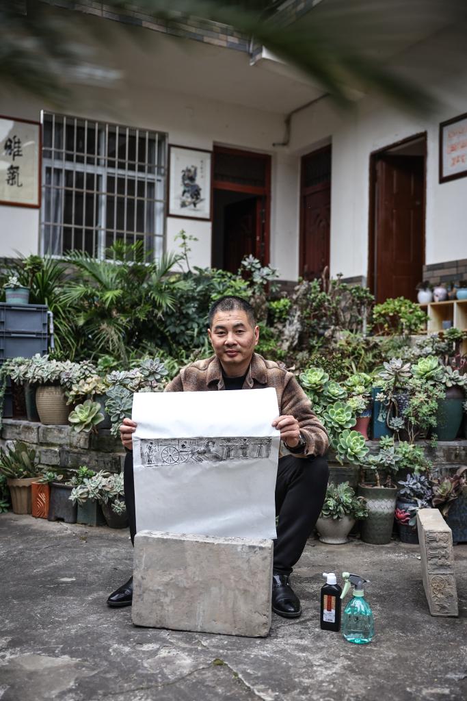 昭化区昭化镇汉砖收藏爱好者饶斌在家中展示汉砖拓印作品(2025年12月13日摄)。