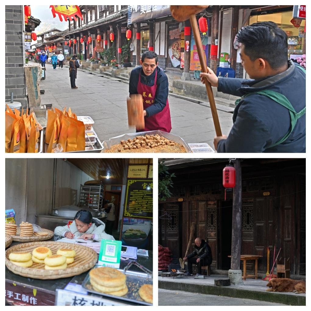 拼版照片:上图为村民在昭化古城内制作核桃酥;左下图为在昭化古城的商铺里,一名小姑娘一边看摊儿一边写作业(2025年12月13日摄);右下图为村民坐在昭化古城内。