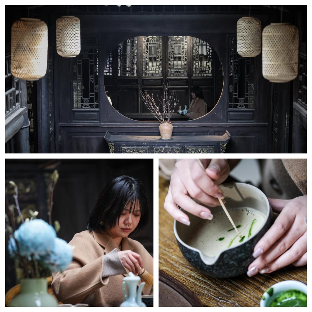 拼版照片:“95后”茶室主理人杨沫在昭化古城一家茶室内制作茶品(2025年12月13日摄)。