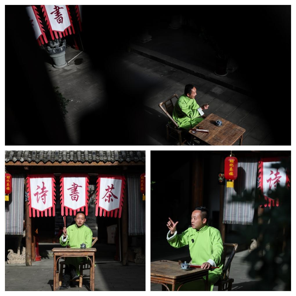 拼版照片:苟欢在表演评书(2025年12月13日摄)。