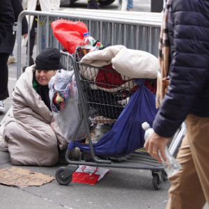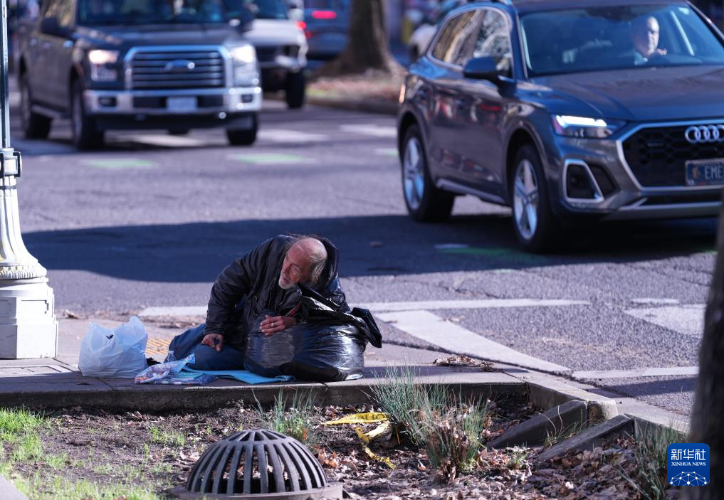 2025年12月31日,在美国纽约街头,无家可归者坐在街边等待帮助。