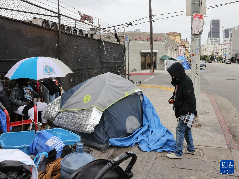 这是2025年12月31日在美国加利福尼亚州洛杉矶市中心拍摄的无家可归者的帐篷。