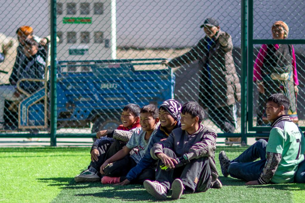 1月5日,在森嘎村的足球场上,少年在观看伙伴们踢球。新华社记者 姜帆 摄