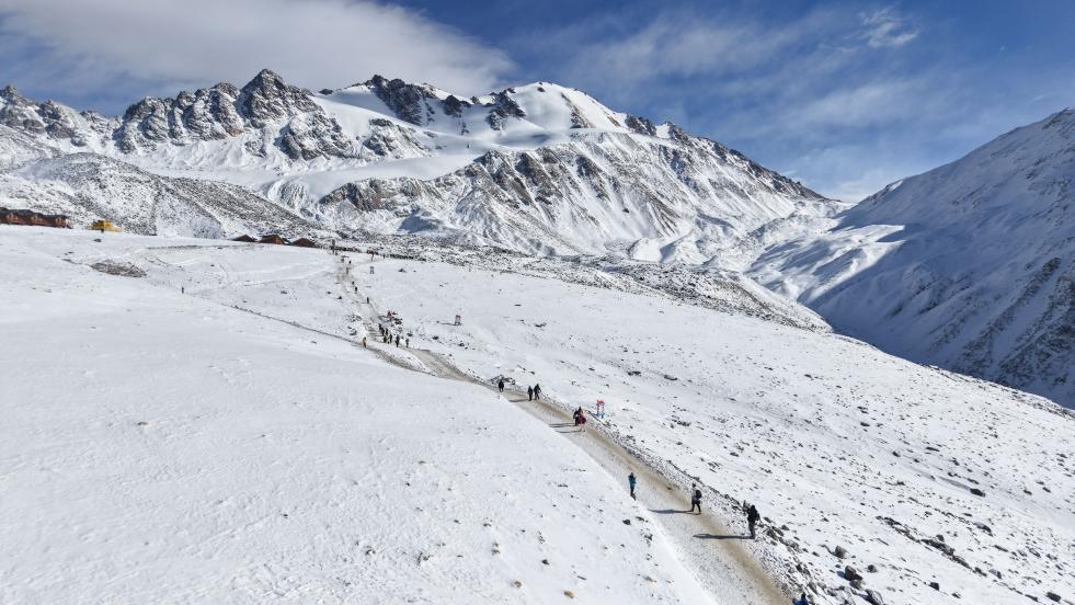1月1日,登山爱好者在攀登岗什卡雪峰(无人机照片)。新华社记者 齐芷玥 摄