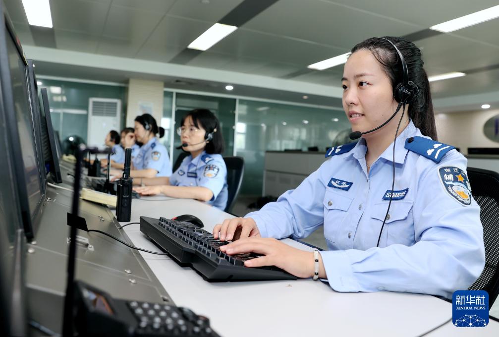 2024年9月17日,江苏省宿迁市公安局110报警服务台辅警在接听群众求助电话。新华社发(王力 摄)