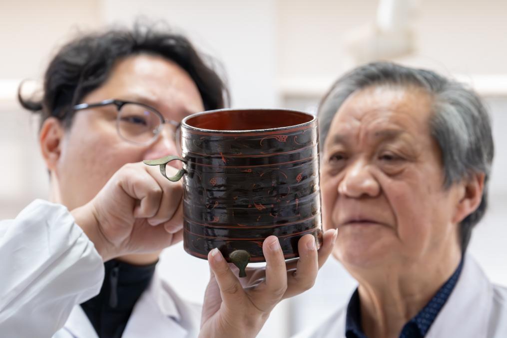 1月9日,在荆州文物保护中心,吴顺清(右)与吴昊在查看一只修复好的漆樽。新华社记者 杜子璇 摄