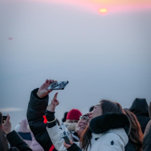 登至滚钟口笔架山,人们找寻空地,或坐或站,原地休息。人群中组织起大合唱,缓解疲劳,传递温度。天色渐明,东方的天边却被一团云笼罩,有人生出了下山的想法,更多人还在等待。时间一分一秒在跺脚取暖声中流逝,“出来啦,太阳出来啦!”突然间的一声呐喊,点燃所有人的激情。人们纷纷拿出手机或相机,与身边的亲人合影。新的一年,正式来临。