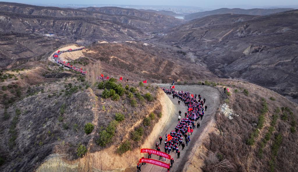 参加徒步祭英烈活动的师生在翻越黄峁山。