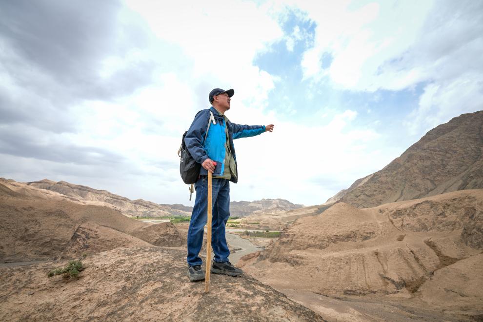 2025年5月13日,李世翔在黄河黑山峡考察途中,站在一处秦兵营遗址上遥指对面山上的长城。