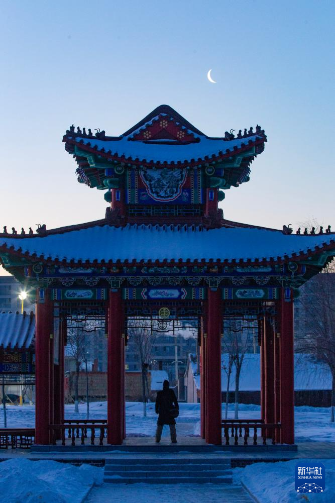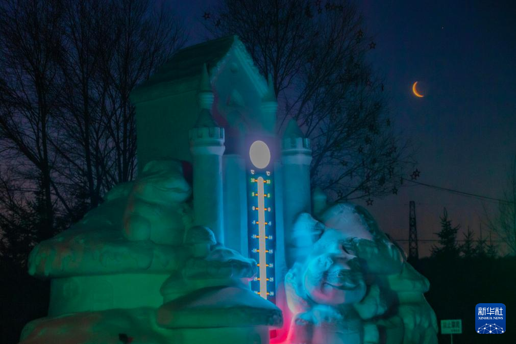 1月15日在黑龙江省同江市拍摄的月亮与雪雕。