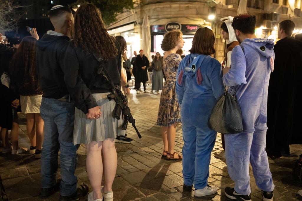 2025年3月13日,在耶路撒冷街头,一名女子携枪出行。