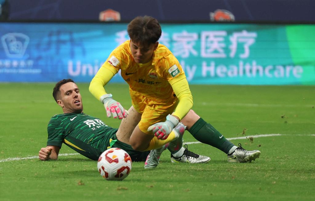 北京国安队球员塞尔吉尼奥(左)和青岛西海岸队守门员李昊在比赛中拼抢。新华社记者 王楷焱 摄