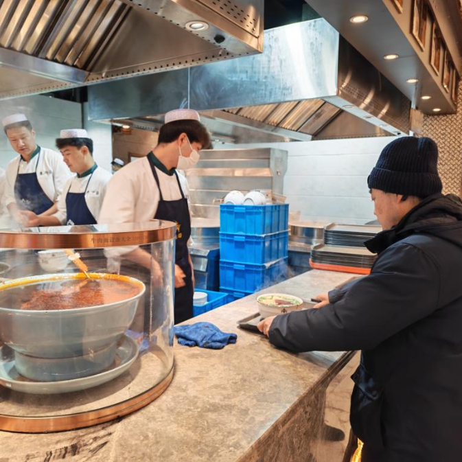 在面馆二楼,兰州牛肉面制作技艺代表性传承人马文斌正在进行拉面表演,揉、抻、摔、拉,细如发丝的“毛细”面瞬间完成。“展示拉面过程,实际也是兰州牛肉拉面文化的推广过程。”马文斌说,越来越多食客了解不同面型的特点、制作的工艺,也加深对兰州牛肉拉面品牌的认可。