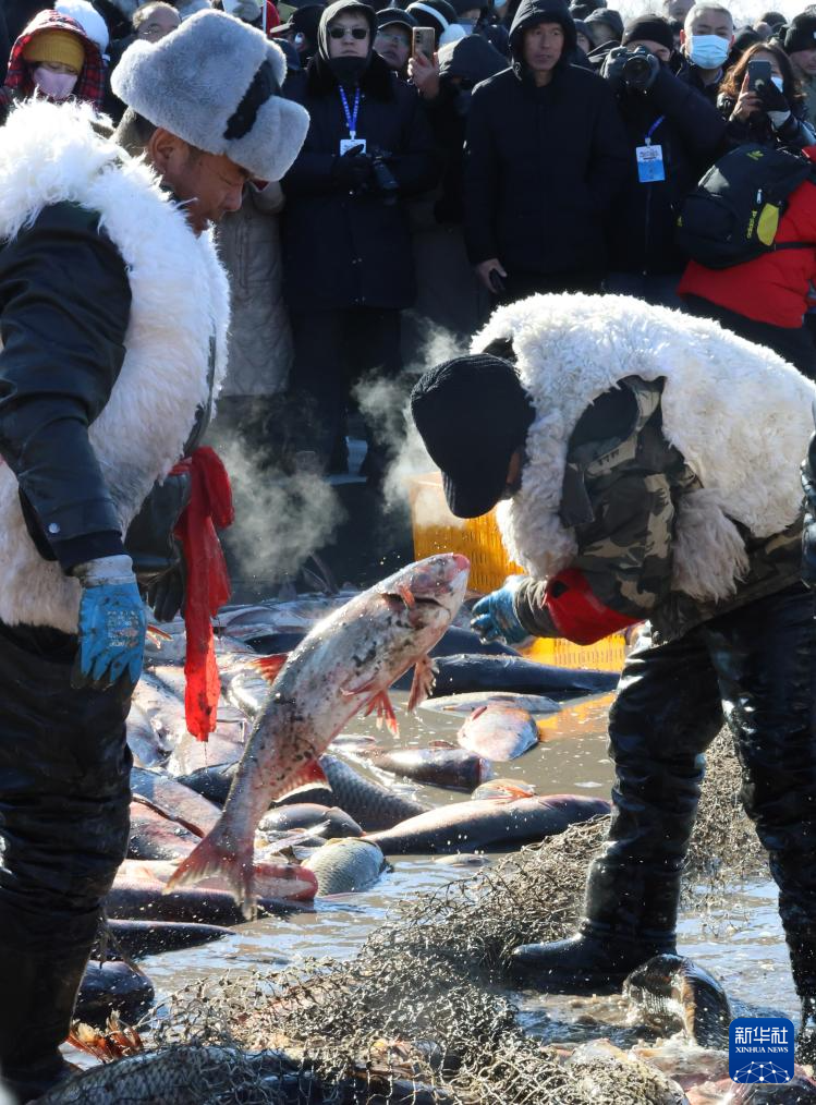 1月24日,在2026第十一届沈阳卧龙湖冬捕季活动现场,渔工将捕捞的大鱼堆放在冰面上。