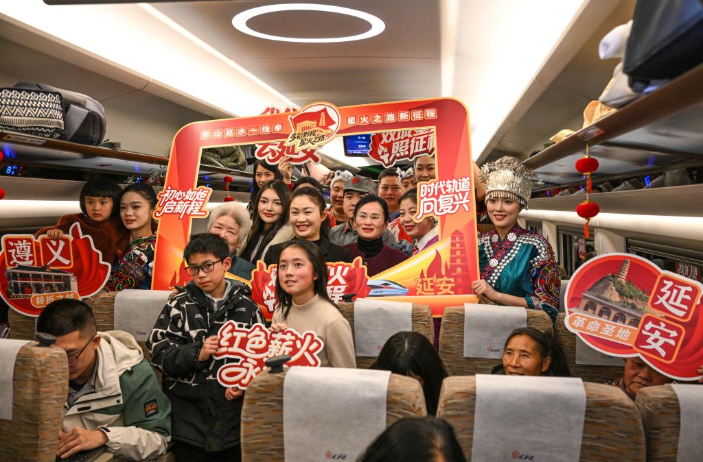 1月26日,遵义开往延安方向的G3360次列车上,旅客与表演人员合影。新华社记者杨文斌 摄