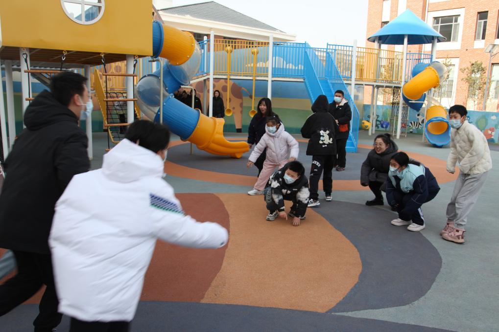 老师和孩子们一起在福利院内玩游戏。(刘俊平 摄)
