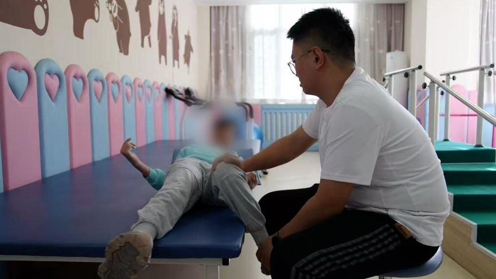 康复师在给孩子做康复训练。(刘俊平 摄)
