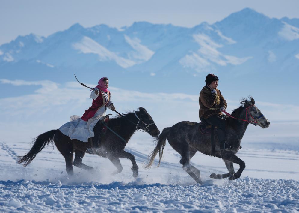 西陲天山,雪峰逶迤。被誉为“天马故乡”的新疆伊犁昭苏县,在南腔北调的欢呼声中,演员们骑马行进在银装素裹的湿地公园,载歌载舞表演牧区传统婚礼。兴之所起,游客与演员共舞一曲,热闹非凡。