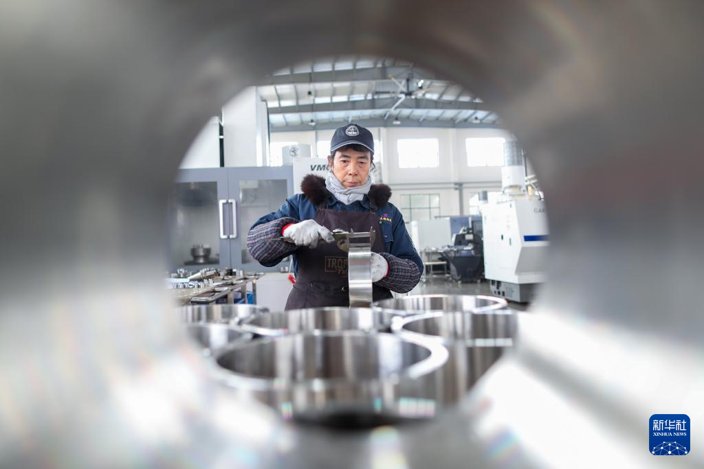 1月29日,工人在位于江苏省兴化市戴南镇的江苏唐刘兴东不锈钢有限公司生产车间检测产品。