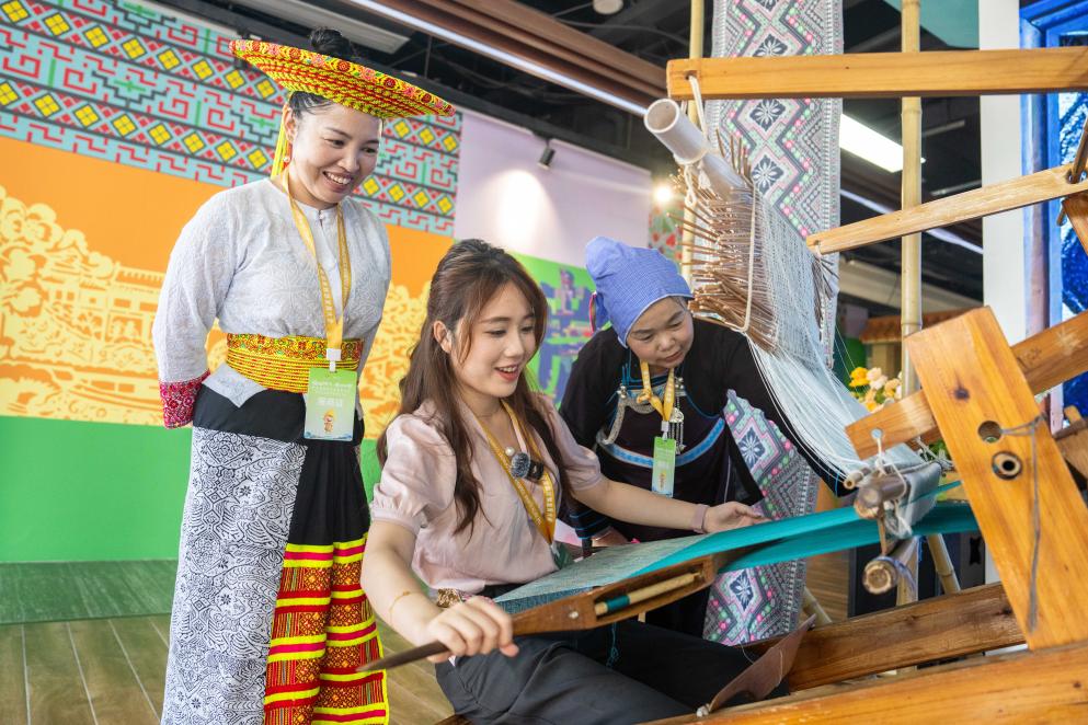2025年9月16日,在湖南省怀化市五溪非遗园,游客在体验侗族织锦技艺。新华社记者 陈思汗 摄