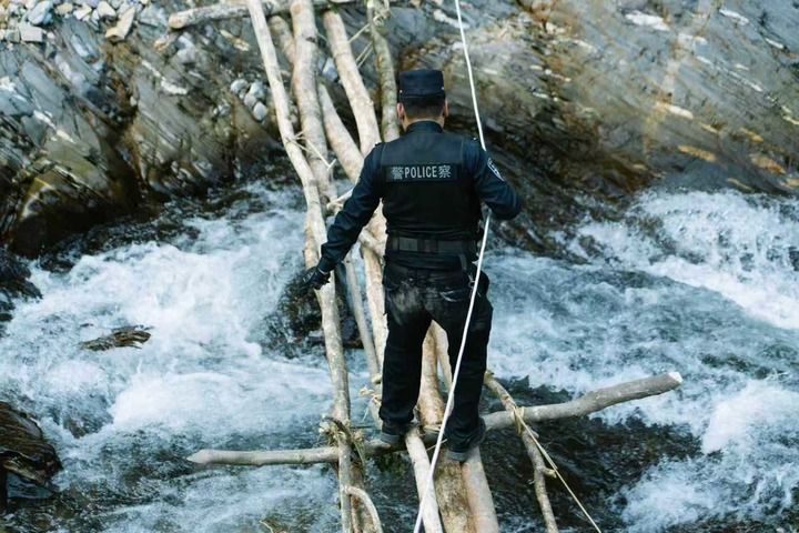 这是吉隆边境派出所移民管理警察手持绳索跨越简易木桥。新华社发(蒋美灵 摄)