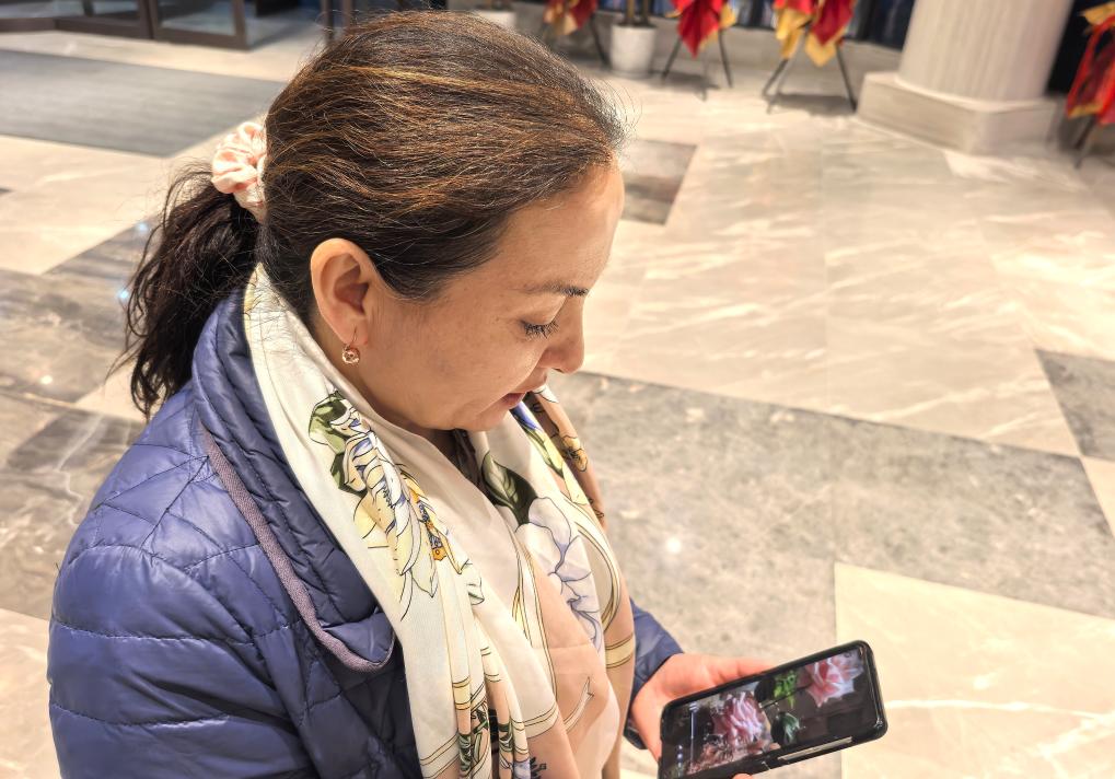 贺娇龙生前同事、昭苏县委宣传部副部长哈丽娜・哈帕尔查看手机拍摄的“娇龙”月季。新华社记者 潘莹 摄