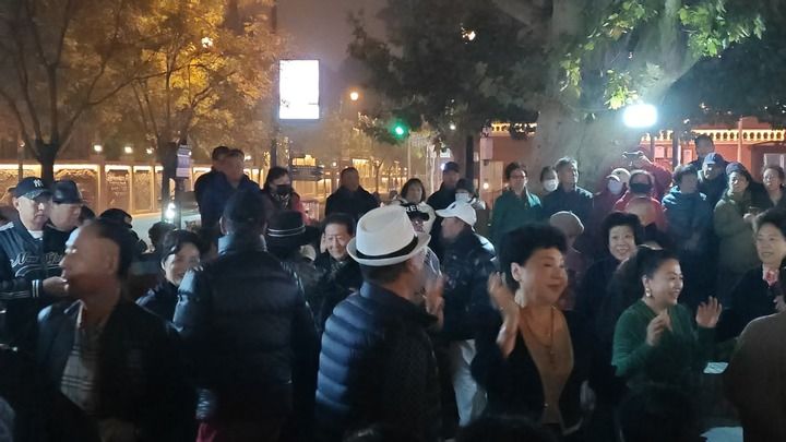 民园广场外跳舞的人。