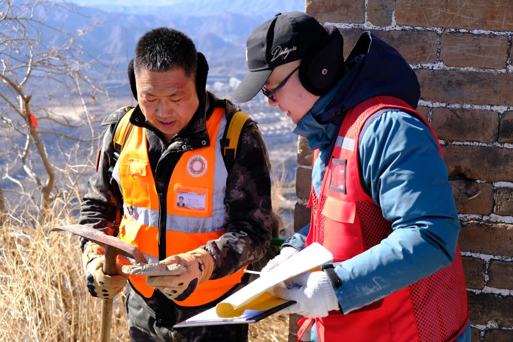 2月11日,周文军和徒弟张文武一起,整理长城边的碎城砖。新华社记者夏子麟 摄