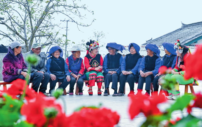 全国人大代表鲁丽华(左五)在云南省南涧彝族自治县无量山镇新政村幸福小院给彝族老人讲解养老政策(2025年3月18日摄) 新华社发(适志宏摄)