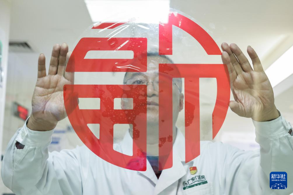 2月12日16时许,急诊科主任于大兴在急诊病房内贴上福字。