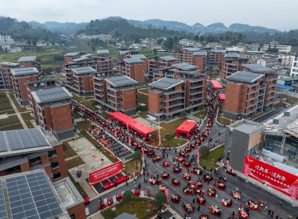 1月31日,在四川宜宾筠连县沐爱镇金坪村避险搬迁安置小区,受灾群众办百家宴迎新年(无人机照片)。新华社记者 江宏景 摄