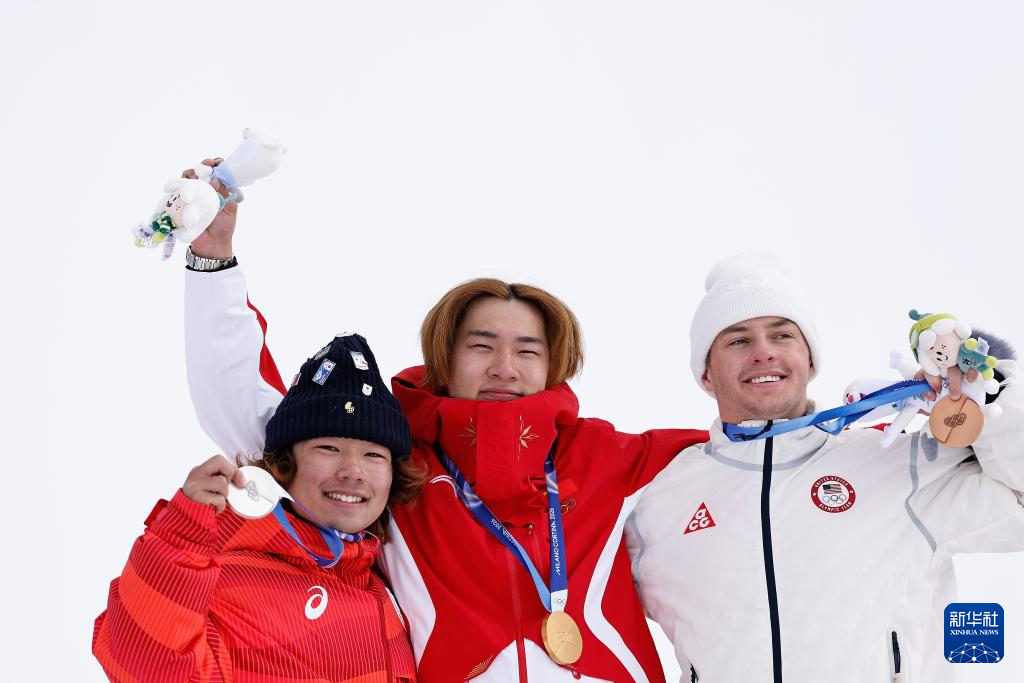 2月18日,冠军中国选手苏翊鸣(中)、亚军日本选手长谷川帝胜(左)和季军美国选手坎特在颁奖仪式上。