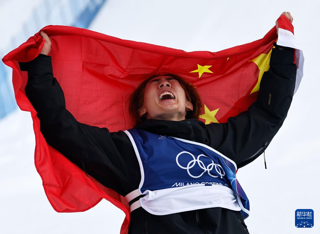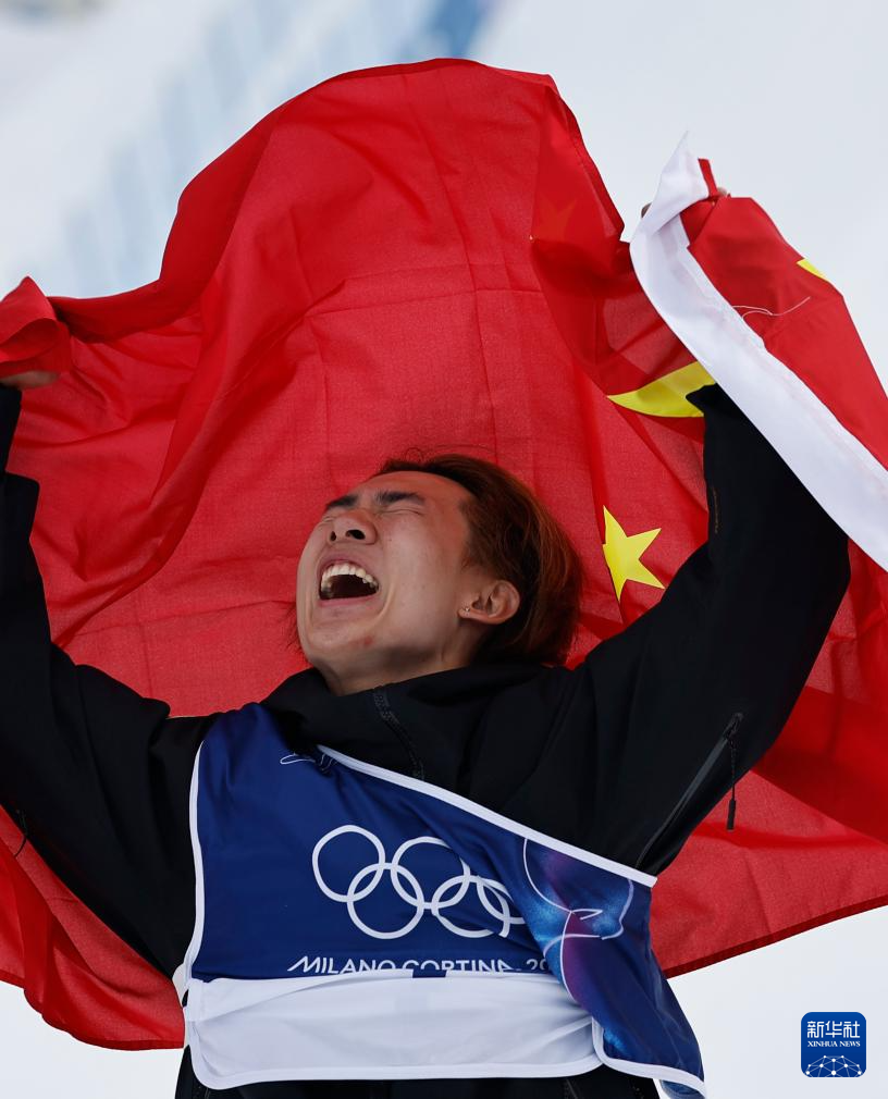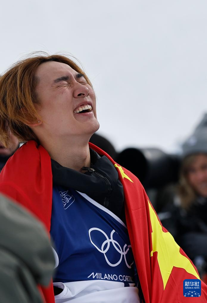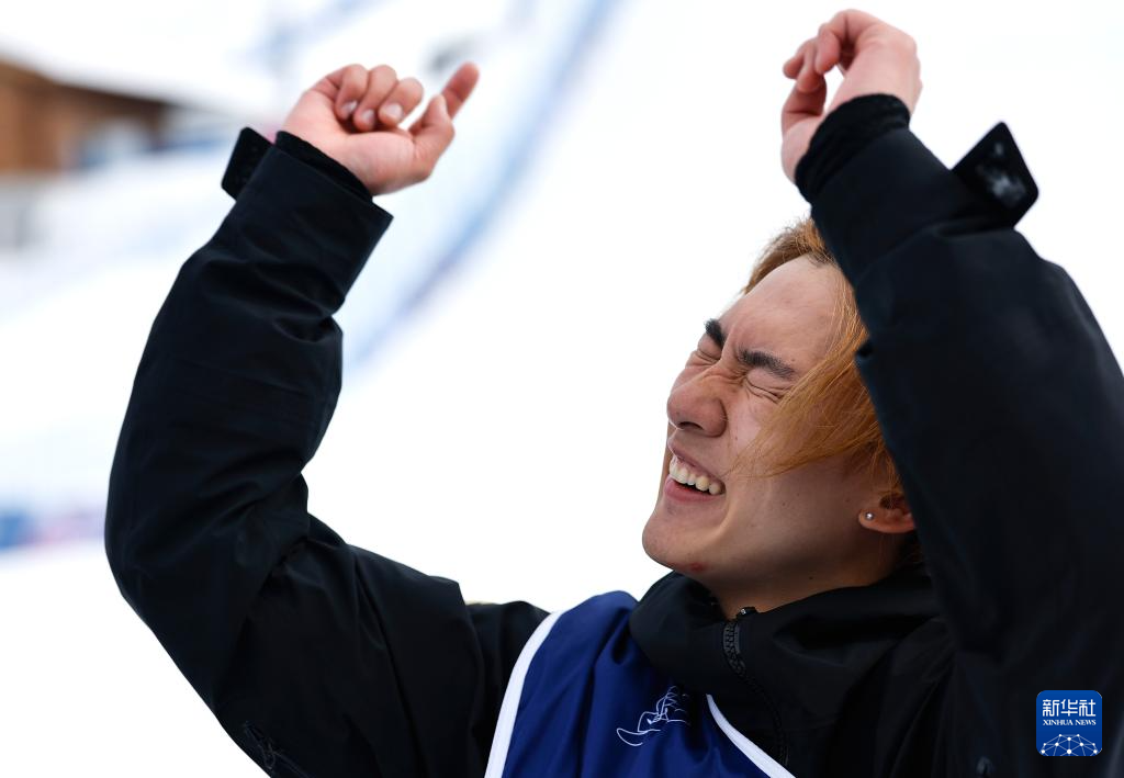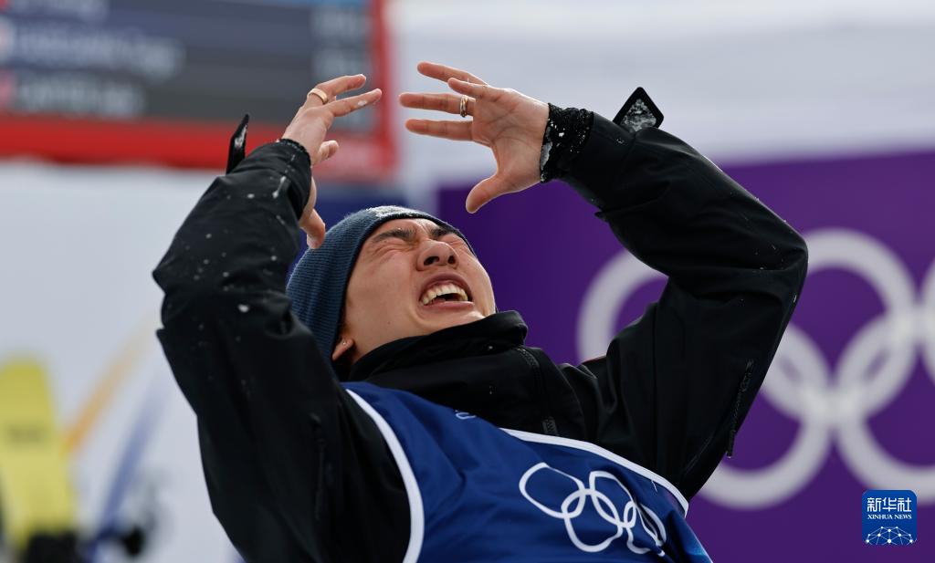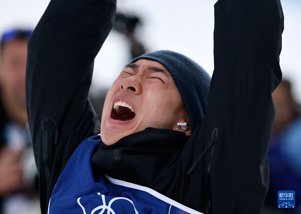 2月18日,中国选手苏翊鸣在比赛后庆祝夺冠。
