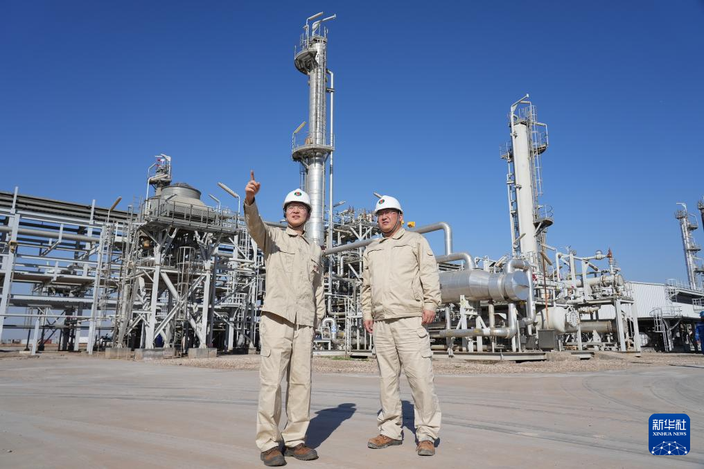 2月16日,在伊拉克瓦西特省,中国绿洲石油公司计划部副经理刘学(左)在艾哈代布油田中心处理站巡检。新华社记者 段敏夫 摄