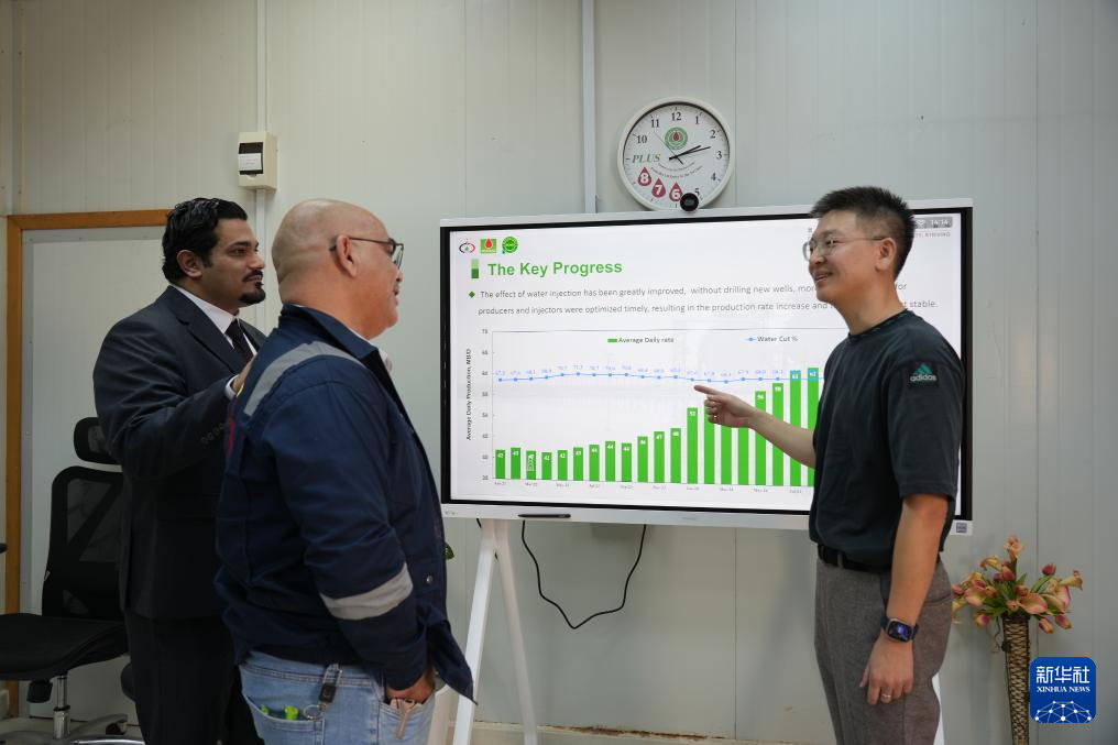 2月16日,在伊拉克瓦西特省艾哈代布油田,中国绿洲石油公司计划部副经理刘学(右一)与伊拉克合作伙伴梳理生产经营任务完成情况。新华社记者 段敏夫 摄