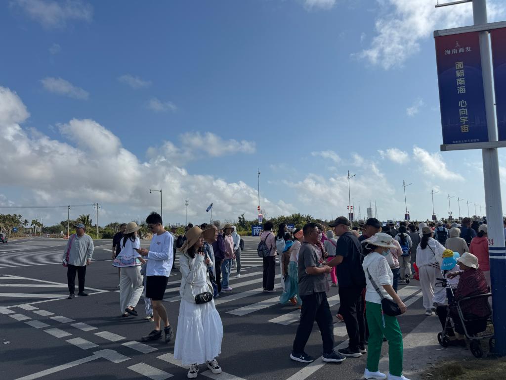 2月11日上午,在海南省文昌市航天大道附近,游客们在等待长征十号运载火箭发射。新华社记者 张晓茹 摄