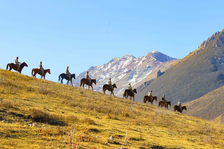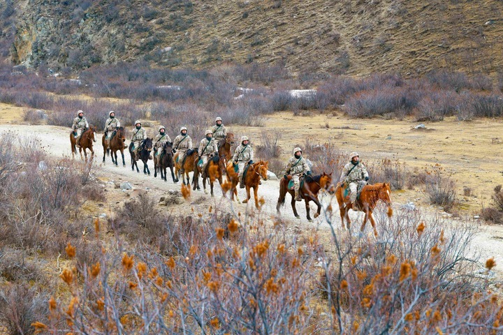 2月8日,陆军第76集团军某旅玉树独立骑兵连官兵在海拔四千余米的巴塘草原展开巡逻。