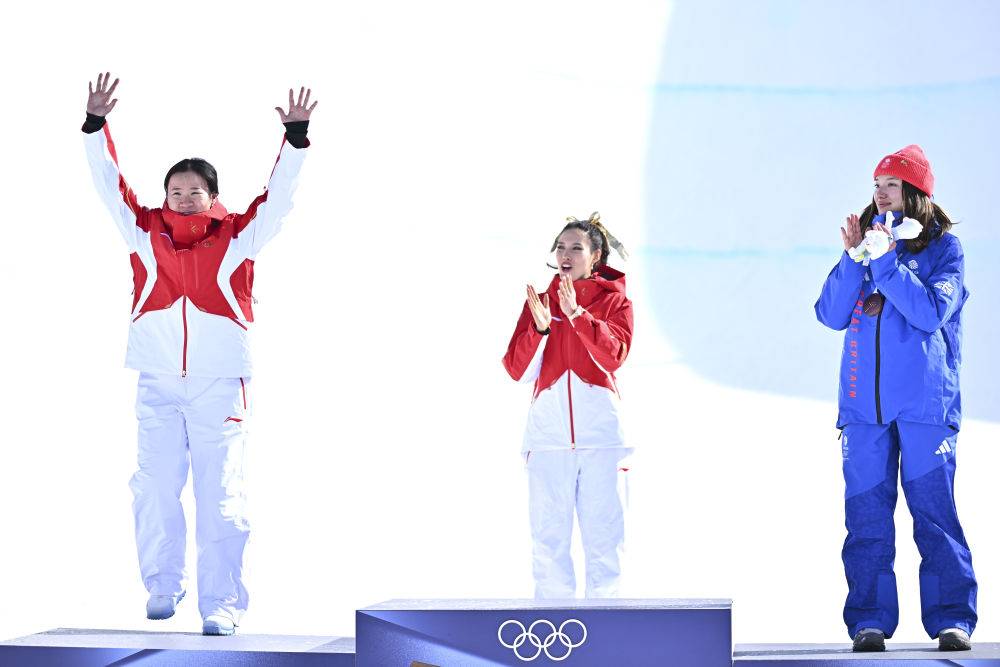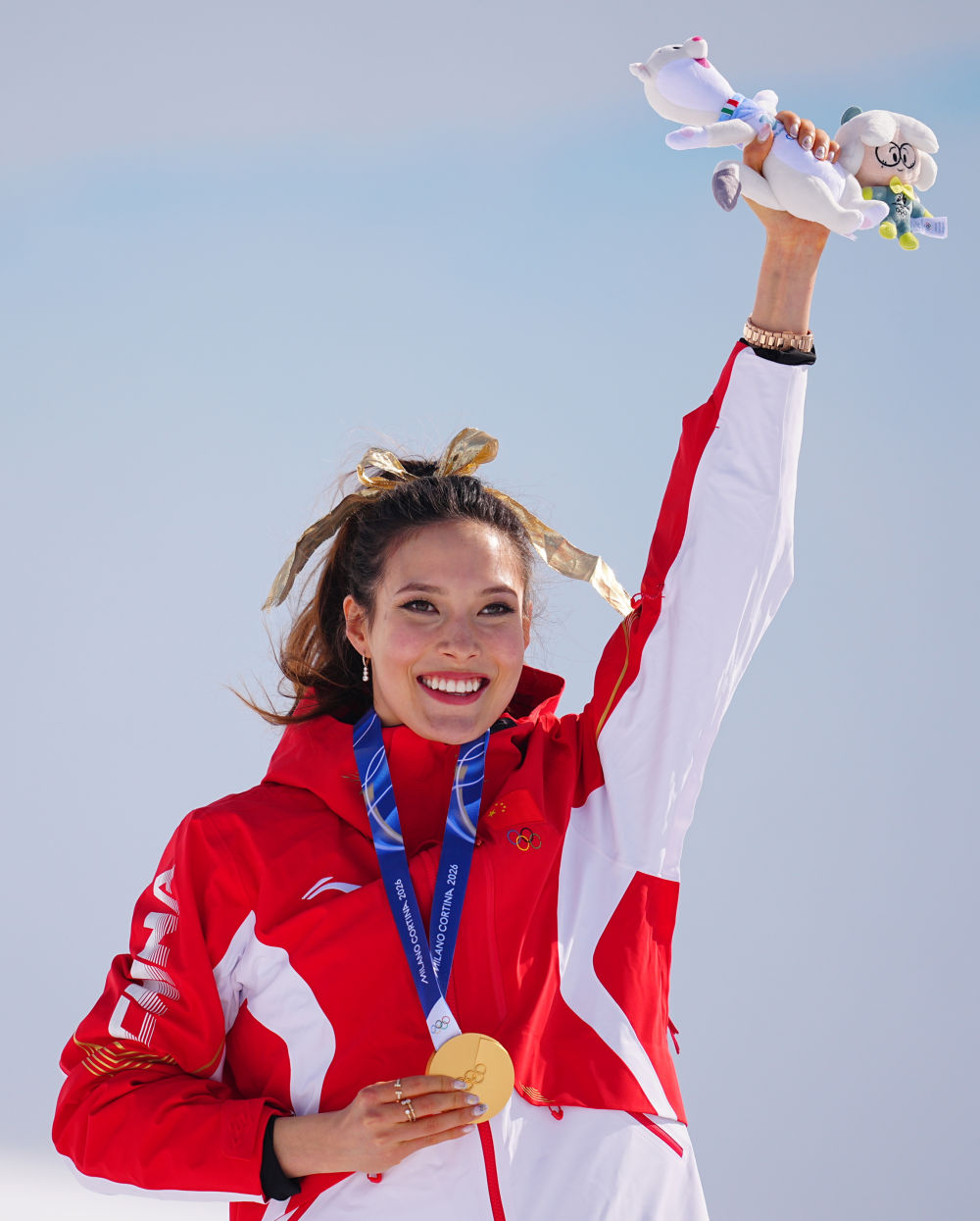 当地时间2月22日,在意大利利维尼奥举行的米兰-科尔蒂纳冬奥会自由式滑雪女子U型场地技巧决赛中,中国选手谷爱凌、李方慧包揽冠亚军。