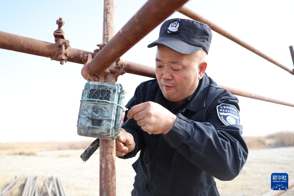 2月5日,甘肃敦煌西湖国家级自然保护区管护中心玉门关保护站工作人员王成海检查用于拍摄普氏野马活动情况的红外相机。