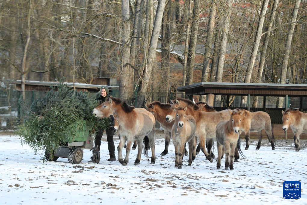 2月19日,在德国柏林动物公园,管理员诺曼·布罗齐奥为普氏野马准备饲料。
